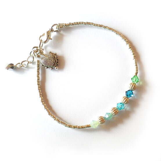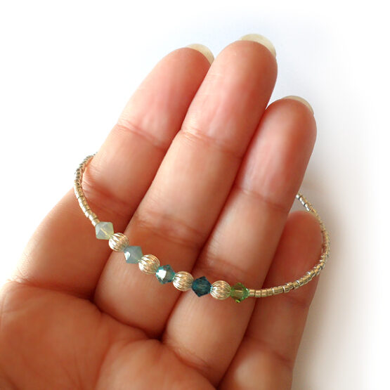 Elegante y delicada pulsera natura creada con cinco cristales de Swarovski en colores azules y verdes , bolitas plateadas y abalorios delica de cristal de la mayor calidad en plata .