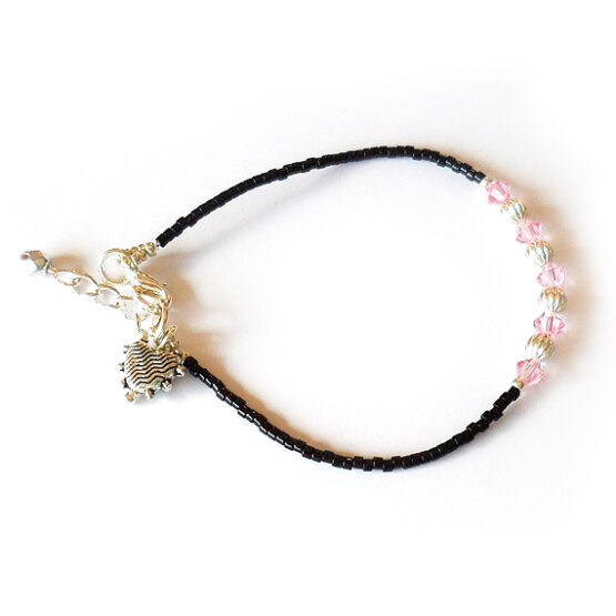 Elegante y delicada pulsera creada con cinco cristales de Swarovski en color rosa , bolitas plateadas y abalorios delica de cristal de la mayor calidad en negro .