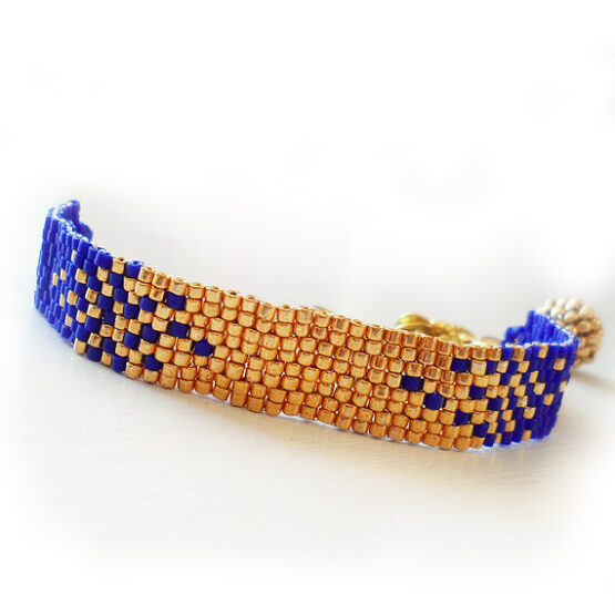 Elegante Pulsera Nadia creada con mas de 400 bolitas de cristal en un diseño de degradado en azul oscuro mate y dorado montados en una larga cadena dorada . Perfecta para Todas las Medidas !