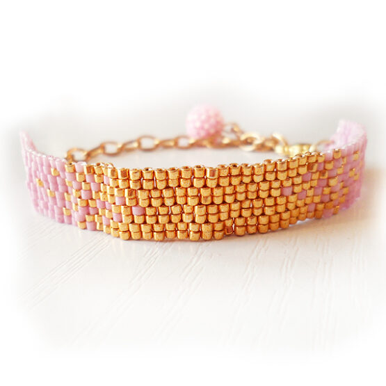 Preciosa y elegante pulsera Ella creada con mas de 400 bolitas de cristal en un diseño de degradado en rosa y oro montados en una larga cadena dorada . Perfecta para Todas las Medidas !