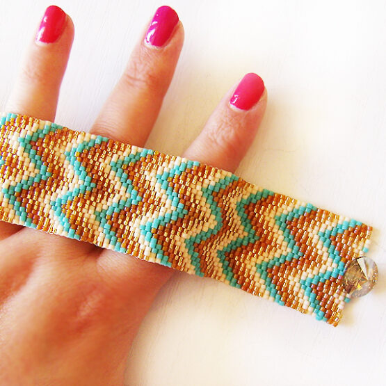 Elegante y original pulsera ancha creada a mano con mas de 2000 abalorios de cristal de la mejor calidad llamados delicas en tonos crema , dorado y azul turquesa y con un hermoso diseño único de dicopebisuteria ! Se cierra con un precioso boton de cristal de Swarovski muy facil de usar !