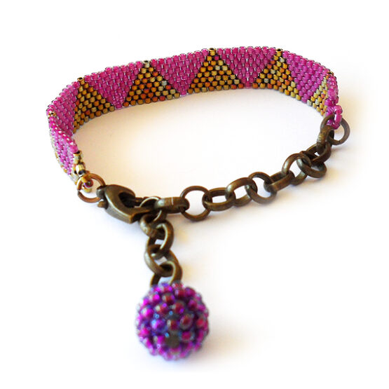 Preciosa y elegante Pulsera Diana creada con mas de 400 bolitas de cristal en un diseño de triángulos color bronce y amatista montados en una larga cadena de bronce . Perfecta para Todas las Medidas !