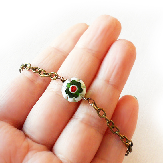 Enamórate de Venecia y su mágico barrio de Castello con esta preciosa pulsera creada con un abalorio de cristal millefiori en forma de flor en colores rojo , blanco y verde .