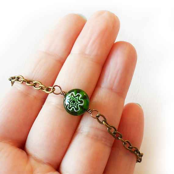 Viaja a Venecia y a su mágico barrio de Santa Croce con esta preciosa pulsera creada con un abalorio de cristal millefiori en forma de flor en colores blanco y verde .