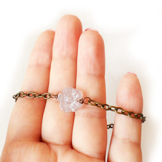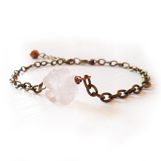 Preciosa y romántica pulsera creada con una flor de piedra semipreciosa de cuarzo rosa tallada y montada en una cadenita de bronce.