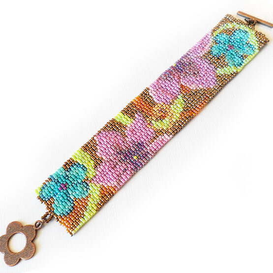 Elegante y original pulsera ancha creada a mano con mas de 2000 bolitas de cristal de la mejor calidad en varios colores rosas , verdes , azules y marrones con un hermoso diseño único de dicopebisuteria y unas 9 horas de trabajo ! Esta preciosa joya para toda la vida se sujeta con un cierre de cobre muy fácil de usar !