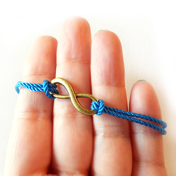 Conecta con el infinito con esta original y sencilla pulsera infinito creada con un charm de bronce y cordón en color azul marino .