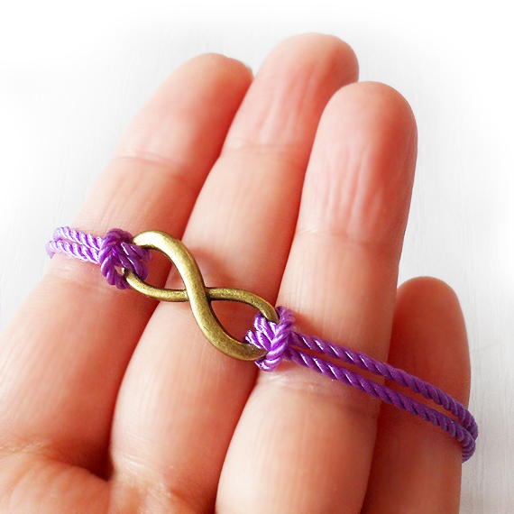 Conecta con el infinito con esta original y sencilla pulsera infinito creada con un charm de bronce y cordón en color lila .