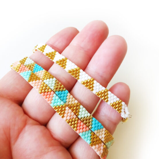 Hermosa pulsera mini piramides creada con cuentas miyuki de cristal bañadas en oro de 24kt y cuentas azules , montadas en plata de ley