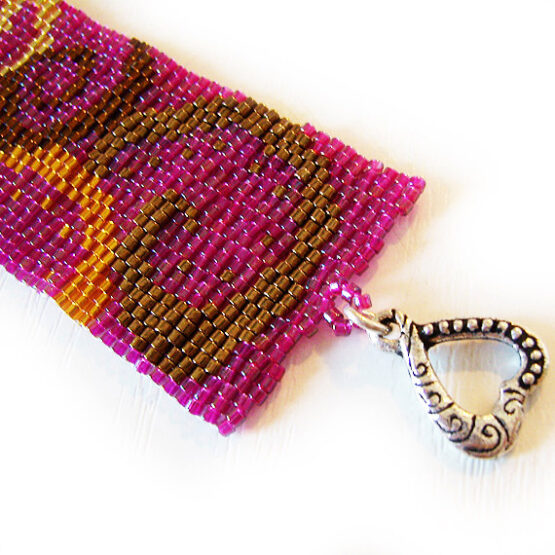 Pulsera ancha creada a mano con mas de 2000 bolitas de cristal de la mejor calidad en colores lila amatista , dorado , bronce y marrones con un hermoso diseño único de dicopebisuteria ! Esta preciosa joya para toda la vida se sujeta con un cierre de plata de ley en forma de corazón muy fácil de usar !