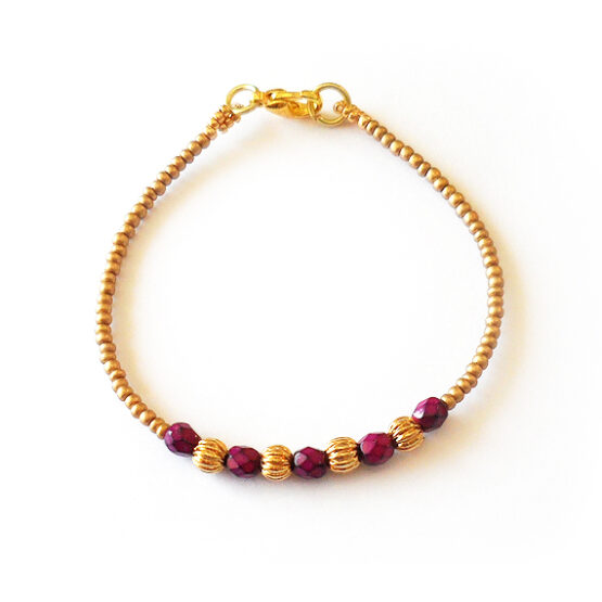 Original pulsera Sheyda que simboliza la pasión y el amor! Esta creada con bolitas facetadas de cristal en tono morado , abalorios dorados y cuentas vintage en un precioso color dorado mate. Perfecta para mezclar con tus pulseras favoritas y dar un toque bohemio a tu estilo!