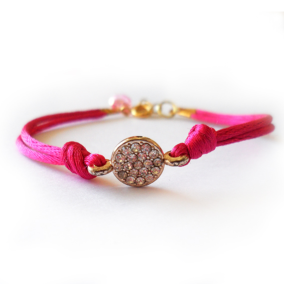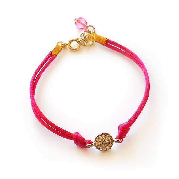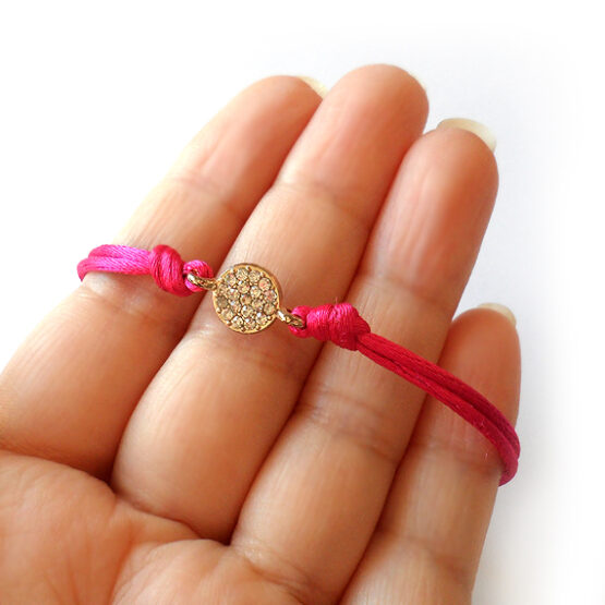 Original pulsera sparkle creada con un charm de cristalitos en dorado rosa y cordón de color fucsia! Perfecta para mezclar con tus pulseras favoritas y crear un look elegante y delicado!