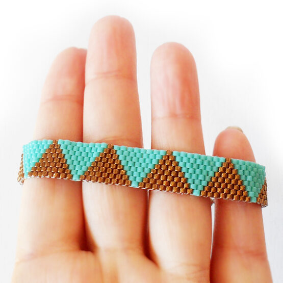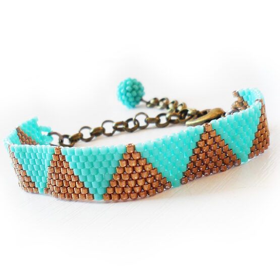 Nueva Pulsera Ashley creada con mas de 400 bolitas de cristal en un diseño de triangulos y colores azul turquesa y bronce montados en una larga cadena de bronce . Perfecta para Todas las Medidas !