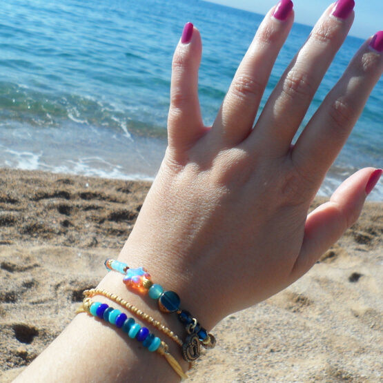 Sueña con la maravillosa playa de Tropea con esta pulsera creada con varias cuentas de cristal en tonos turquesa y azules que recuerdan a los cristalitos que podemos encontrar en la playa!! Ideal para tu verano!