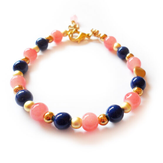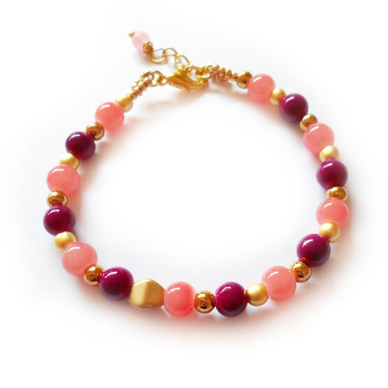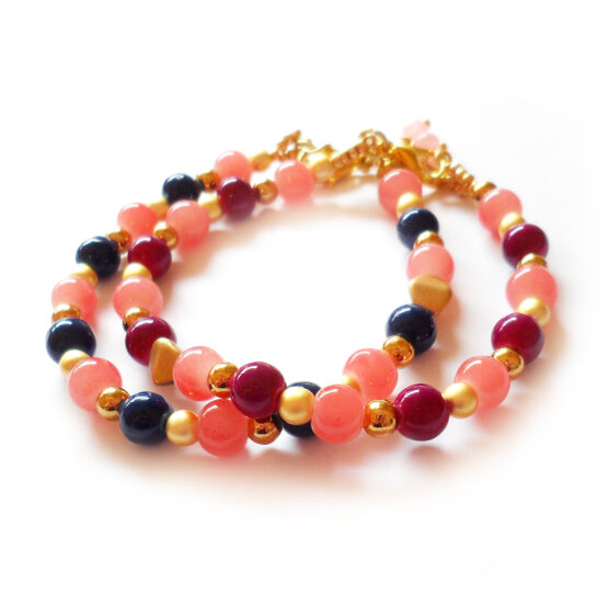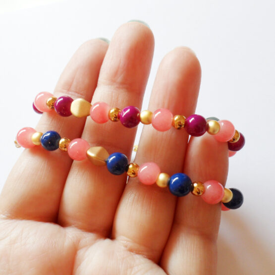 Sueña con la maravillosa playa rosa de Elafonisi en Creta y sus aguas cristalinas con estas pulseras creadas con varias cuentas de cristal en tonos rosa coral y combinados con bolitas doradas y cuentas moradas o azules oscuras !!Perfecta para combinar con otras pulseritas!